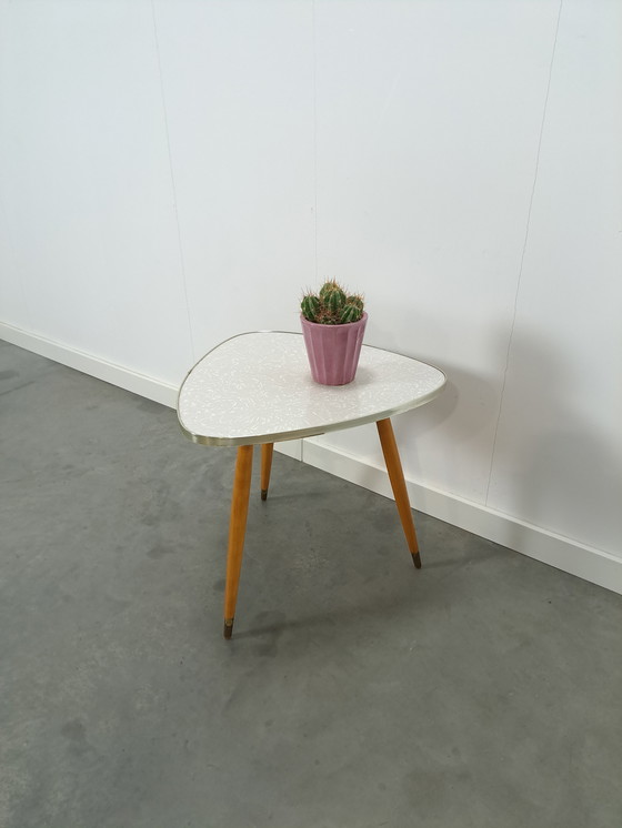 Il tavolino è in buone condizioni, con evidenti segni di usura coerenti con la sua età. Il bordo del piano in formica è leggermente sfrangiato.