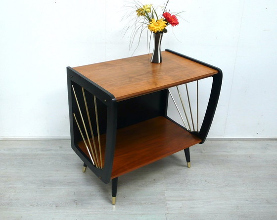 Tavolino anni '50 con ripiano noce + nero, gambe inclinate, Rockabilly Mid Century