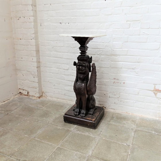 Tavolino asiatico antico, probabilmente della fine del XIX secolo. Sopra il leone alato in legno massello splendidamente intagliato, poggia un piano in marmo lucido. Buone condizioni, con segni di un vecchio coleottero delle corna lunghe.