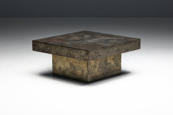 Questo tavolino brutalista nello stile di Pia Manu degli anni '70 è realizzato interamente in acciaio. Questo pezzo scultoreo presenta un piano quadrato con un motivo botanico inciso che conferisce una morbidezza organica alla forma architettonica altrimenti audace. La superficie in acciaio ha una tonalità variegata di grigi caldi, marroni e bronzi che rivelano una texture lavorata a mano. La solida base cubica del tavolo sostiene uno spesso piano sporgente con motivo a foglie incise, sottilmente intarsiato.