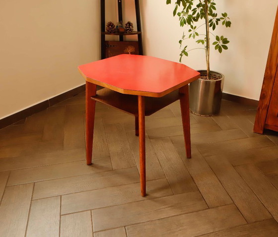 Questo affascinante tavolino retrò degli anni '60 si distingue per l'audace piano rosso e la struttura semplice e funzionale tipica dei mobili cecoslovacchi dell'epoca. È stato prodotto in una delle aziende di mobili con sede a Brandýs nad Labem, come conferma l'etichetta originale sul lato inferiore.