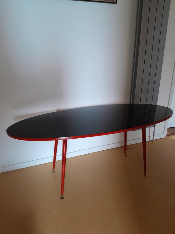 Le gambe sottili rosse gli conferiscono un aspetto moderno e giocoso.