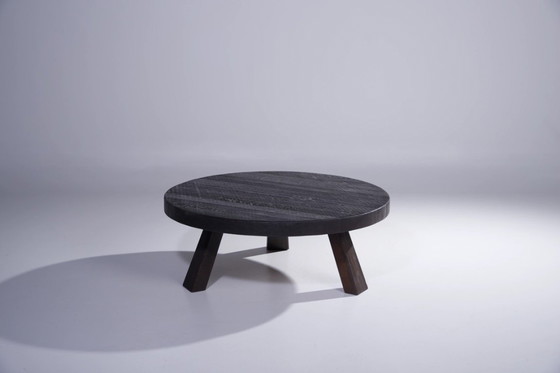 Splendido tavolino brutalista realizzato nei Paesi Bassi in rovere massello. La sua forma audace e scultorea e la finitura marrone scuro intenso esaltano le venature e la consistenza naturali del legno. Recentemente riverniciato e laccato, questo pezzo unisce un carattere grezzo a un look raffinato e moderno.