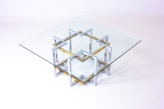 Un tavolino da caffè in ottone e cromo dalla forma piuttosto originale. Le curve e gli angoli intrecciati dei tubi creano un interessante gioco tra i due eleganti colori.
