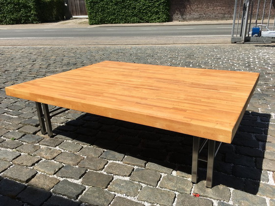 Tavolino da caffè in acciaio inox con piano in legno di faggio