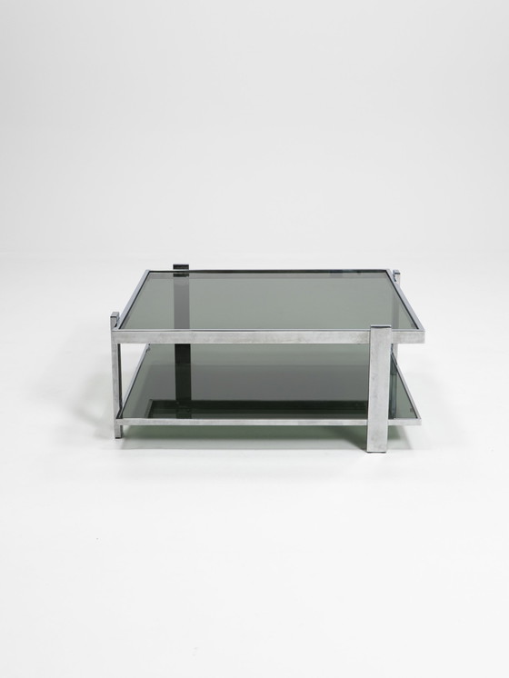 Il designer di questo tavolino da caffè in vetro cromato e fumé potrebbe non conoscerci, ma possiamo dire con certezza che aveva una buona comprensione delle proporzioni. Anche il produttore ci sfugge, lasciandoci dietro solo il fatto che aveva accesso a materiali pregiati e sapeva come usarli. Come se fossero fatte di barre d'argento, le gambe di questo tavolo sono leggermente spostate verso gli angoli, senza perdere nulla della stabilità e guadagnando molto più stile. Questo gesto semplice ed elegante è sufficiente a distinguere questo tavolino da caffè dalla moltitudine di altri ben fatti, ma noiosi.