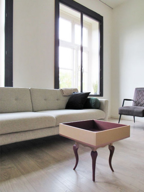 Un tavolino vintage molto speciale di forma quadrata. Il piano è in legno di betulla chiaro, laccato internamente con finitura "frutti di bosco". La base è beige opaco e le gambe sono anch'esse nella stessa tonalità.