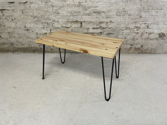 Affascinante tavolino in legno di recupero dal carattere unico e con strutture in legno naturale. Le gambe a forcina, minimaliste e verniciate a polvere nera, sono prodotte in Germania e conferiscono al tavolo un aspetto moderno e industriale. Un pezzo unico elegante che combina perfettamente sostenibilità e design.