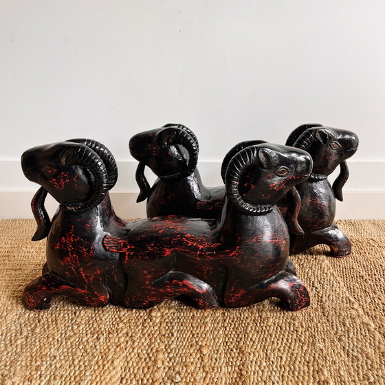 Questo esclusivo tavolino da caffè a doppia testa di ariete, realizzato in legno intagliato, risale al 1970 circa. Presenta un intricato motivo con due teste di ariete, che mettono in risalto una sorprendente combinazione di colori nero e rosso. Aveva un piano in vetro, ma era troppo danneggiato. Poiché è più facile spedirlo senza, non ne ho ordinato uno nuovo. Contattatemi se desiderate che ne ordini uno per voi. Dimensioni: 59 x 17 x 33 cm di altezza ciascuno.