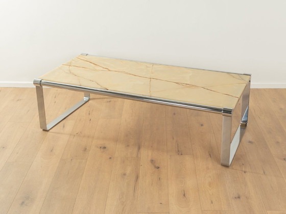 Splendido tavolino da caffè degli anni '70. Struttura in acciaio inox cromato con piano in marmo onice nei toni del crema e del marrone. Prodotto in Germania. Buone condizioni con lievi segni di usura.
