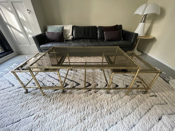Tavolino vintage unico con struttura in ottone e bambù e vetro fumé.