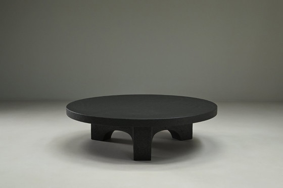 Tavolino da caffè brutalista in resina nera, anni '70, Paesi Bassi. Questo spazioso tavolino da caffè brutalista risale agli anni '70 ed è realizzato in resina colata effetto pietra. Realizzato in un unico pezzo, presenta una solida presenza scultorea, con una superficie dalla texture pronunciata che gioca un ruolo chiave nel design e nel carattere complessivo del pezzo. Il piano rotondo è sorretto da una base distintiva con intagli ad arco, che conferisce un forte senso architettonico pur mantenendo equilibrio e stabilità. La sua tonalità scura e la materialità audace lo rendono un pezzo sorprendente ma versatile, adatto sia ad interni moderni che a interni di ispirazione vintage. Si sa poco del designer o del produttore originale, ma lo stile mostra somiglianze con le opere di Ado Chale. Un tavolo ben proporzionato e di carattere, con una forte presenza visiva. In ottime condizioni vintage.