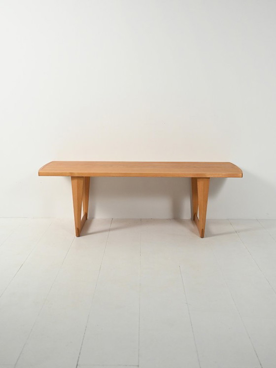 Progetto attribuito a Svante Skogh per AB Säffle Möbelfabrik. Struttura in rovere con gambe con struttura triangolare unite da traverse, un dettaglio formale distintivo. Piano con bordi delicatamente smussati e una sottile smussatura, proporzioni calme ed equilibrate che mettono in risalto le venature. Marchio originale del produttore sotto il piano. Un pezzo raffinato e da collezione, fedele al linguaggio di Skogh.