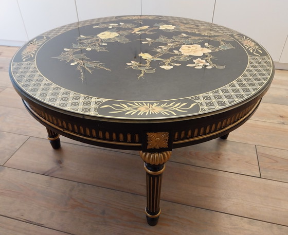 Questo splendido tavolino da caffè Maitland-Smith Chinoiserie è un vero e proprio elemento di spicco nel vostro soggiorno. Con i suoi eleganti dettagli neri e oro e i raffinati motivi floreali, questo tavolino dona un tocco di fascino orientale ai vostri interni. Perfetto per un'accogliente zona salotto o come raffinato centrotavola.