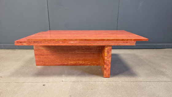 Questo splendido tavolino da caffè in travertino rosso degli anni '70 è un vero e proprio elemento d'arredo che cattura lo sguardo in qualsiasi ambiente. Con le sue tonalità ricche e calde e le linee pulite, questo tavolo aggiunge un tocco di eleganza retrò al vostro soggiorno.