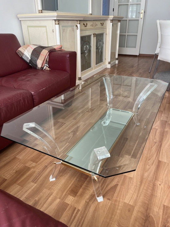 Bellissimo tavolino da caffè in vetro italiano in vendita. Con vetro sfaccettato (vedi foto) e base a specchio. Il tavolo è rettangolare e ha una base a specchio. Nessun danno. Prodotto in Italia. Dimensioni: Larghezza 70 cm, Lunghezza 130 cm, Altezza 40 cm.