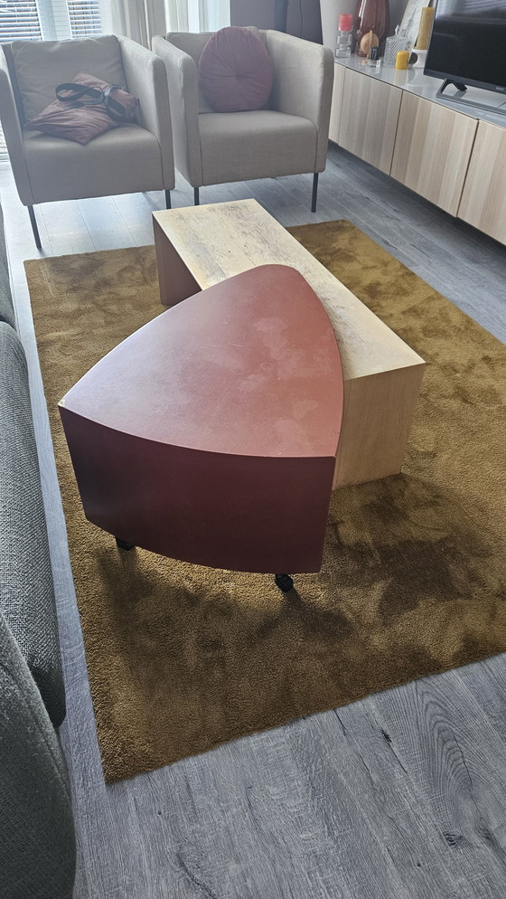 Tavolino da caffè con due sezioni, una delle quali è regolabile e dotata di una sezione mobile organica.