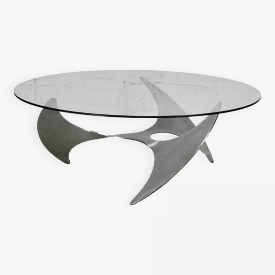 Dimensioni: H31 x L90 x P90 Colore: Argento Materiali: Metallo Stile: Design Tavolo "Propeller", designer Knut Hesterberg, produttore Ronald Schmitt. Base in acciaio, lastra di vetro rotonda appoggiata su di essa (vetro "sottile" vintage, non "di sicurezza", 6 mm di spessore). Circa 1970. Solido e in buone condizioni, piccoli segni e graffi, piccole buche. Vedi foto. Design anni '70.