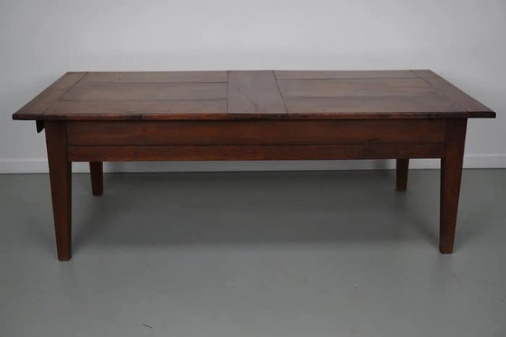 Questo tavolino è stato ricavato da un vecchio tavolo da cucina in rovere di una fattoria. Il tavolo ha mantenuto una splendida patina e un colore intenso nel corso degli anni. Ha dimensioni pratiche e un cassetto.