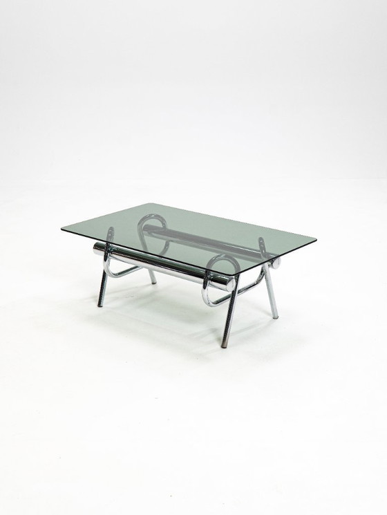 Immergiti nell'eleganza degli anni '70 con questo scultoreo tavolino da caffè cromato con nodo, un capolavoro di design e funzionalità. La straordinaria base cromata del tavolo, realizzata con intricati dettagli a nodo, sostiene un elegante piano in vetro, creando un armonioso mix di materiali che trasuda raffinatezza e stile.