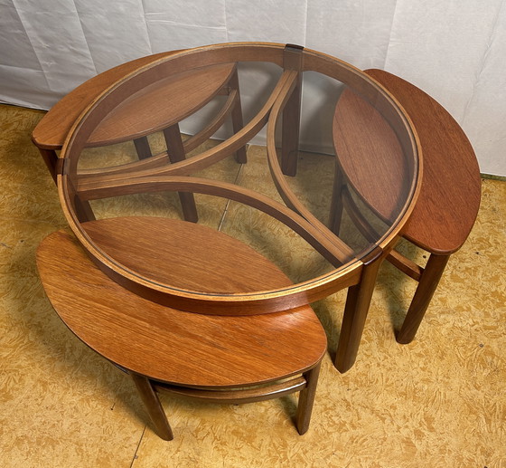 Aggiungi un pezzo elegante e versatile al tuo spazio abitativo con questo tavolino rotondo Trinity di Nathan, completo di piano in vetro e tre tavolini laterali sovrapponibili sottostanti. Un vero classico di metà secolo, questo set combina splendidamente praticità e design iconico. Fondata all'inizio del XX secolo, Nathan Furniture è celebre per la sua artigianalità britannica e per i suoi design eleganti e funzionali. I suoi pezzi di metà secolo, come questo tavolino Trinity, riflettono un mix di influenze scandinave e britanniche, rendendoli molto ricercati dagli appassionati di mobili vintage. Questo set di tavoli è realizzato in caldo e resistente legno di teak abbinato a un piano rotondo in vetro, offrendo un aspetto equilibrato e arioso che si adatta sia agli interni vintage che a quelli moderni. Le venature del legno e il vetro insieme creano un sofisticato punto focale in qualsiasi soggiorno. I tre tavolini laterali sovrapponibili, riposti senza soluzione di continuità sotto il tavolino, offrono opzioni flessibili per l'intrattenimento, consentendo di estrarre superfici extra per bevande, libri o decorazioni a seconda delle esigenze. Con le sue linee pulite, la forma arrotondata e il design minimalista, questo pezzo incarna l'elegante bellezza dello stile moderno di metà secolo, rendendolo funzionale ed elegante. Questo tavolino rotondo Trinity di Nathan è la scelta perfetta per chi desidera integrare un design senza tempo di metà secolo con una maggiore versatilità nella propria casa. Curato con cura, presenta lievi segni del tempo che ne esaltano il fascino vintage. L 81 cm x P 81 cm x A 50,5 cm.