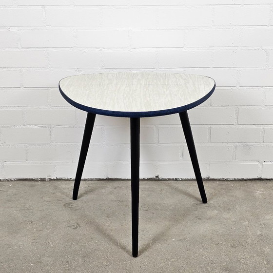 Bellissimo tavolino vintage in ottime condizioni. Piano in formica con splendidi bordi blu. Questo tavolino risale agli anni '50 ed è in ottime condizioni.