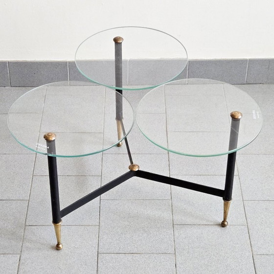 Tavolino a treppiede degli anni '50, originariamente utilizzato come espositore da negozio. Prodotto da DEKORA, Nantes, Francia. I ripiani in vetro sono usurati e presentano segni d'uso e graffi. L'ottone dorato presenta una leggera ossidazione. Altezza 37,5 cm. Un ripiano misura 30 cm di diametro. Lunghezza 60 cm. Larghezza 60 cm. Una volta aperto, misura 90 cm di lunghezza e 90 cm di larghezza. Il tavolino verrà completamente smontato per il trasporto.