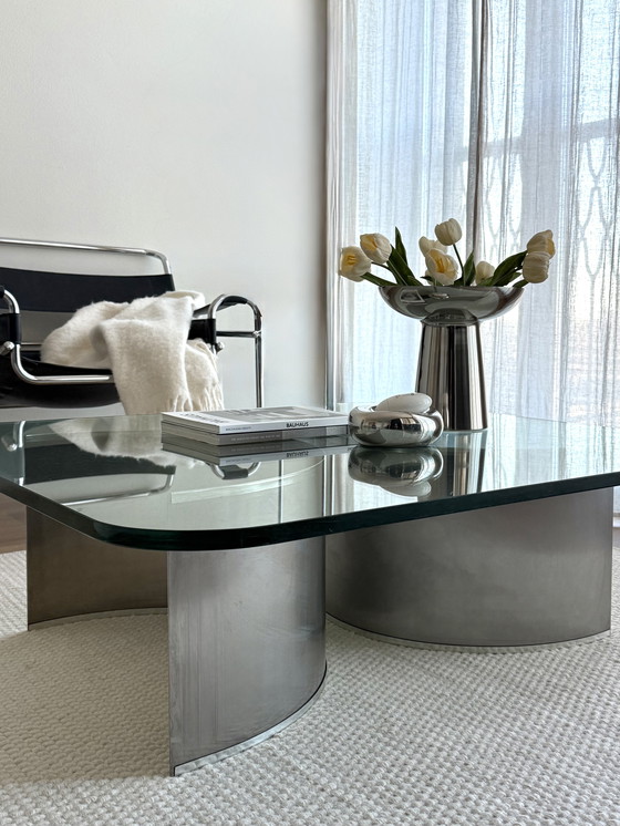 Bellissimo e unico tavolino di design degli anni '70. Il tavolo ha un piano quadrato in vetro spesso 2 cm e una base in acciaio inox. La base può essere posizionata in diverse posizioni.