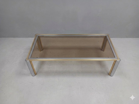 Il tavolo si distingue immediatamente per lo straordinario contrasto della struttura: una combinazione di elegante cromo lucido e caldi dettagli in ottone. Questo design bimetallico era il marchio di fabbrica di Belgo Chrome e conferisce al tavolo un aspetto esclusivo e stratificato.