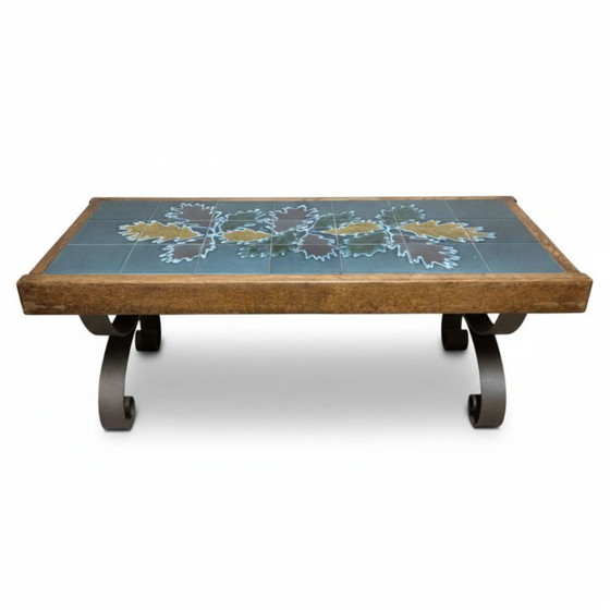 La solida struttura in legno aggiunge calore e definizione alle piastrelle di ceramica, mentre le gambe in ferro forgiato garantiscono stabilità e un profilo scultoreo. Il tavolo è ben conservato, con una patina naturale data dal tempo su metallo e legno, coerente con la sua costruzione d'epoca.