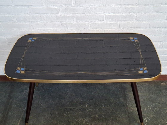 Tavolino da caffè vintage con piano in vetro e gambe inclinate