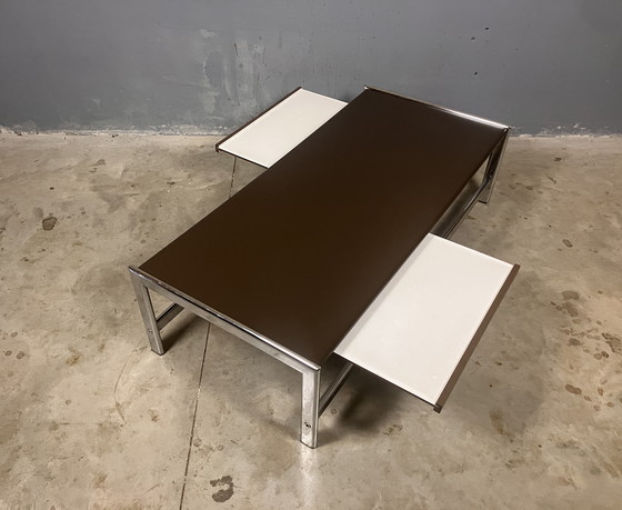 Tavolino da caffè esclusivo degli anni '70. Struttura cromata con piano laminato marrone. Sia la struttura che il piano sono arrotondati. Le esclusive prolunghe permettono di avvicinare riviste o bevande.