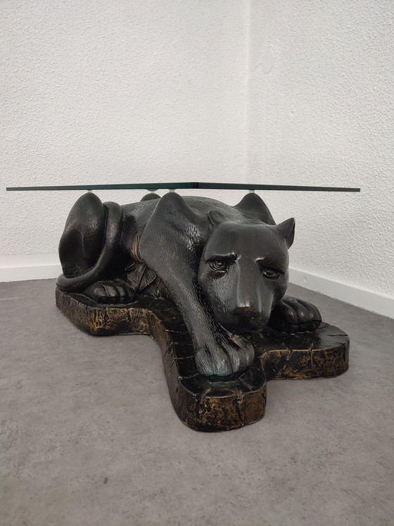 Questo esclusivo tavolino vintage degli anni '80, prodotto negli Stati Uniti, è un pezzo di grande impatto che aggiunge un tocco di carattere a qualsiasi ambiente. Il piano in vetro poggia elegantemente su una base scultorea in fibra di vetro a forma di pantera sdraiata, conferendo dinamismo e stile ai vostri interni.