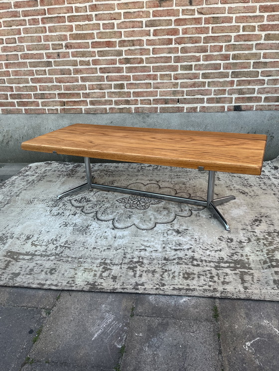 Tavolino da caffè vintage di metà secolo con uno splendido piano in rovere massello, lungo 1,40 metri, largo 59 cm e spesso 4,5 cm. Il piano è sostenuto da una base cromata con splendidi dettagli, come le staffe cromate che lo tengono in posizione. Risalente alla fine degli anni '60, in buone condizioni vintage.