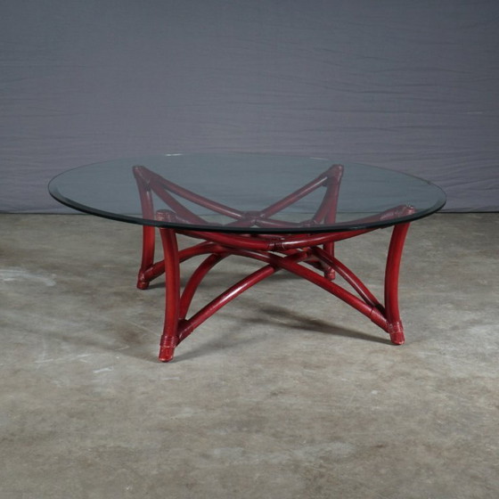 Un bellissimo tavolino da caffè naturale con base in bambù/manou rosso e piano in vetro. L'ampio piano in vetro conferisce a questo tavolo un aspetto arioso. Ogni stanza ha bisogno di un tocco di outdoor. Questo tavolo sarebbe un'aggiunta fantastica a una veranda o a un soggiorno, ad esempio. Il tavolo è praticamente nuovo!