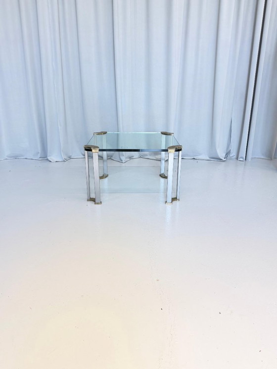 Immergiti nell'eleganza degli anni '70 con questo squisito tavolino vintage disegnato da Peter Ghyczy. Realizzato in Germania, questo pezzo incarna la sofisticata combinazione di bronzo e vetro, offrendo un fascino senza tempo che si adatta a qualsiasi interno raffinato.