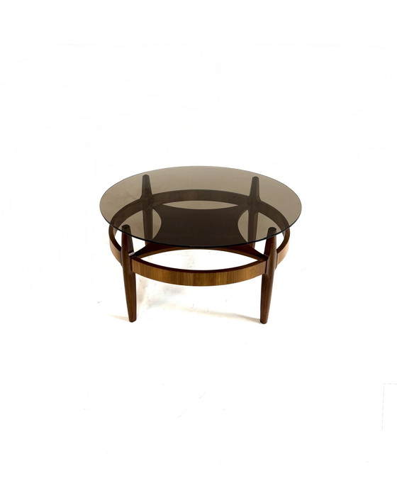 Il tavolo ha un piano rotondo in vetro fumé con bordi smussati. Un bellissimo piano in vetro fumé scuro. Un abbinamento perfetto con la struttura. Il tavolo è in ottime condizioni. Il piano poggia liberamente sulla struttura in legno.