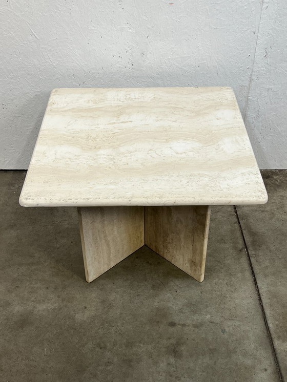Un tavolino da caffè quadrato in travertino molto elegante, con una splendida gamba a croce, anch'essa in travertino. I bordi del piano sono arrotondati. La gamba a croce è composta da due parti separate, consentendo al tavolo di adattarsi a diversi stili. In buone condizioni, con solo lievi segni di usura. Un vero gioiello per i vostri interni.