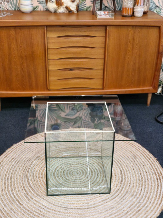 Tavolino da caffè vintage in stile Space Age, anni '70. La base è un cubo di vetro, e anche il piano è in vetro e poggia liberamente sopra. È possibile posizionare oggetti decorativi nella gamba/piede. Questo elegante tavolino a cubo è in splendide condizioni vintage.