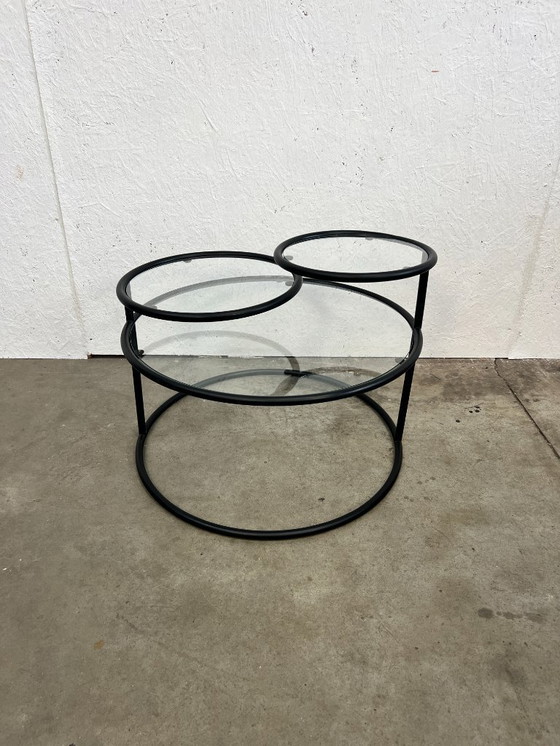 Un elegante tavolino girevole da caffè o da appoggio. È composto da tre piani di diverse dimensioni, i due esterni dei quali sono pieghevoli. Il pezzo ha una splendida e raffinata struttura in acciaio nero e piani in vetro. Prodotto nei Paesi Bassi negli anni '70. In buone condizioni, con solo lievi segni di usura.