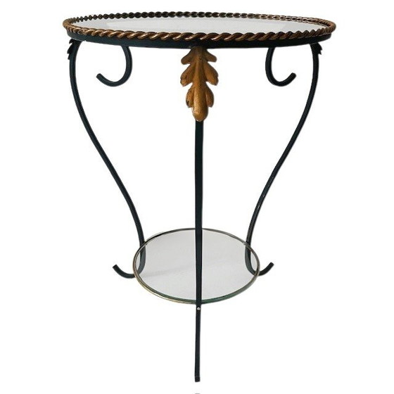 Bellissimo tavolino da giardino vintage in ferro battuto di metà secolo con dettagli in vetro e oro a forma di foglie d'acanto, risalente agli anni '60. È un ottimo modo per mettere in mostra le tue piante. Questo tavolino da giardino boho è alto circa 47,5 cm e ha un diametro di 43 cm.