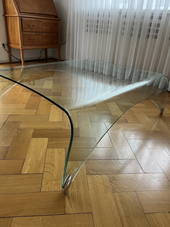 Tavolino da caffè o tavolino da divano in vetro vintage modernista chiamato GENIO, progettato da Massimo Iosa Ghini nel XX secolo. La forma chiara, curva e a cascata conferisce al tavolo un aspetto leggero e fluttuante. Solo i piedini in metallo aggiungono un senso di stabilità. Un bellissimo design del famoso designer Massimo Iosa Ghini, membro del movimento di design d'avanguardia Memphis Group di Ettore Sottsass e responsabile di numerose installazioni in catene di negozi e hotel. Il tavolino è firmato e realizzato in vetro di sicurezza da Fiam, Italia. Le sue condizioni vintage sono molto buone, senza danni e con qualche piccolo graffio. Il design pulito e semplice si adatta perfettamente a un ambiente moderno o tradizionale. Dimensioni approssimative: Larghezza 110,5 cm, Profondità 62,5 cm, Altezza 37 cm. Designer: Massimo Iosa Ghini. Stile: Moderno. Materiali: Vetro e metallo. Luogo di origine: Italia. Periodo: 1990-1999.