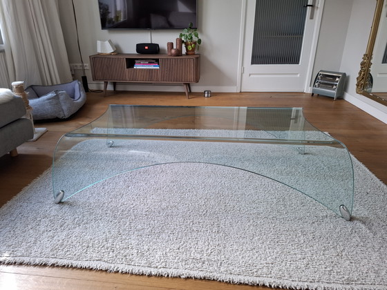 Tavolino da caffè o tavolino da divano in vetro vintage modernista chiamato GENIO, progettato da Massimo Iosa Ghini nel XX secolo. La forma a cascata, chiara e curva, conferisce al tavolo un aspetto leggero e fluttuante. Solo le gambe metalliche con supporto ne sottolineano la solidità. Un bellissimo design del famoso designer Massimo Iosa Ghini, membro del movimento di design d'avanguardia di Ettore Sottsass, il Gruppo Memphis, e responsabile di numerose installazioni in catene di negozi e hotel. Il tavolino è firmato e realizzato in vetro di sicurezza da Fiam, Italia. Le sue condizioni vintage sono buone, con alcuni graffi dovuti al tempo. Il design pulito e semplice si adatta perfettamente a un ambiente moderno o tradizionale. Dimensioni approssimative: Larghezza 140 cm, Profondità 70 cm, Altezza 37 cm. Produttore: Massimo Iosa Ghini. Stile: Moderno. Materiali: Vetro e metallo. Luogo di origine: Italia. Epoca: 1990-1999.