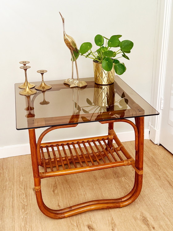 Questo bellissimo tavolino o tavolino francese è realizzato in rattan e ha un piano in vetro fumé.