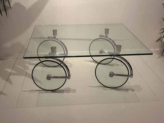 supporti in acciaio cromato massiccio e ruote in vetro con