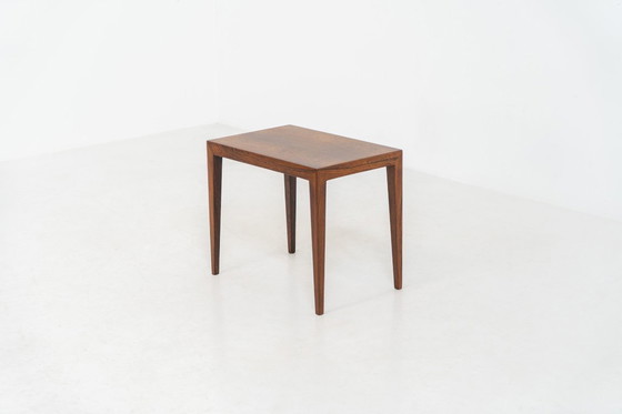 Un tavolino di pregevole fattura, realizzato in pregiato palissandro, che mette in mostra una splendida venatura e un design elegante e minimalista. L'incastro senza stelo tra il piano e le gambe testimonia l'eccezionale maestria artigianale e rappresenta una tecnica distintiva di Severin Hansen.
