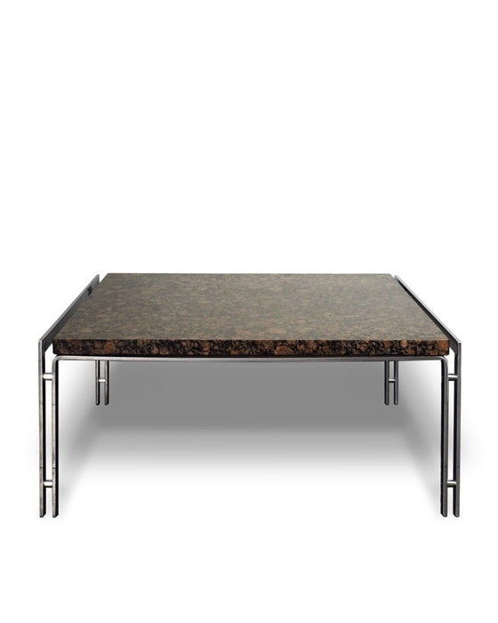 Tavolino con piano in pietra naturale che poggia su una struttura tubolare cromata minimalista attribuita a Horst Brüning For Kill. Il tavolino è in ottime condizioni vintage, ad eccezione di una piccola scheggiatura sull'angolo inferiore del piano (vedi foto).