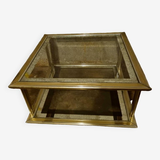 Struttura in metallo dorato e argentato, vetro fumé con fascia eglomisee, mercurizzato su tutto il perimetro che forma una fascia a specchio che incornicia il piano.