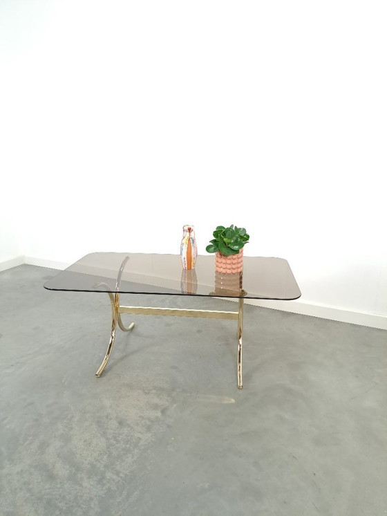 Tavolino in vetro fumé con gambe dorate dalla Svezia