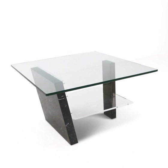 Elegante tavolino quadrato italiano dal design contemporaneo realizzato negli anni Settanta. Questo tavolo unico presenta una base in marmo nero con ripiano in plexiglass e un piano in vetro spesso.